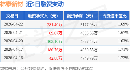 证券之星消息,4月22日,林泰新材(920106)融资买入512.5万元,融资偿还231.1万元,融资净买入281.4万元,融资余额5177.93万元,近20个交易日中有12个交易日出现融资净买入。