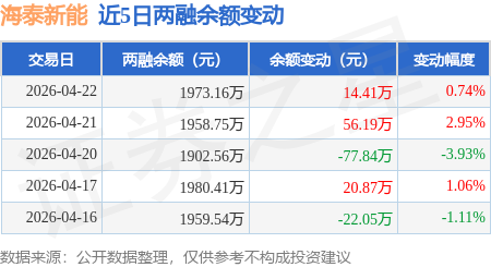 证券之星消息,4月22日,海泰新能(920985)融资买入60.26万元,融资偿还45.85万元,融资净买入14.41万元,融资余额1973.16万元。