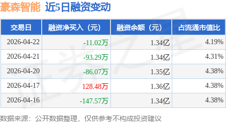 证券之星消息,4月22日,豪森智能(688529)融资买入574.11万元,融资偿还585.13万元,融资净卖出11.02万元,融资余额1.34亿元。