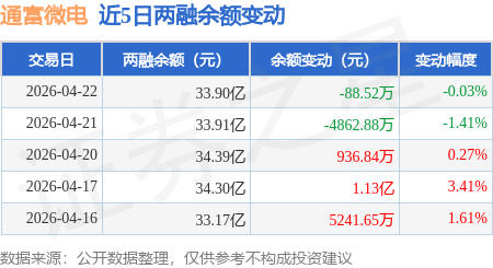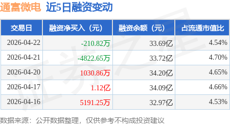 证券之星消息,4月22日,通富微电(002156)融资买入4.88亿元,融资偿还4.9亿元,融资净卖出210.82万元,融资余额33.69亿元。