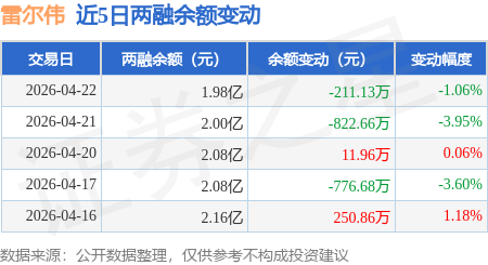 证券之星消息,4月22日,雷尔伟(301016)融资买入509.34万元,融资偿还720.47万元,融资净卖出211.13万元,融资余额1.98亿元,近20个交易日中有11个交易日出现融资净买入。