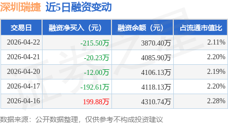 证券之星消息,4月22日,深圳瑞捷(300977)融资买入283.16万元,融资偿还498.66万元,融资净卖出215.5万元,融资余额3870.4万元。