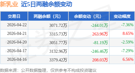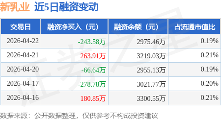 证券之星消息,4月22日,新乳业(002946)融资买入179.81万元,融资偿还423.39万元,融资净卖出243.58万元,融资余额2975.46万元。