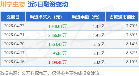 证券之星消息,4月22日,川宁生物(301301)融资买入607.51万元,融资偿还1656.11万元,融资净卖出1048.61万元,融资余额4.81亿元。