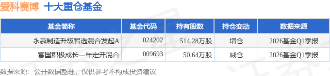 持有爱科赛博最多的基金为永赢制造升级智选混合发起A,目前规模为2.93亿元,最新净值1.4003(4月22日),较上一交易日上涨2.12%。该基金现任基金经理为胡泽。