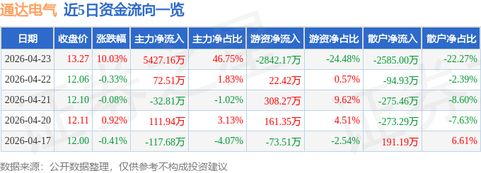 证券之星消息,截至2026年4月23日收盘,通达电气(603390)报收于13.27元,上涨10.03%,换手率2.5%,成交量8.75万手,成交额1.16亿元。