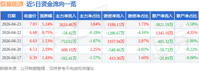 证券之星消息,截至2026年4月23日收盘,银星能源(000862)报收于7.03元,上涨5.24%,换手率15.81%,成交量99.3万手,成交额6.85亿元。