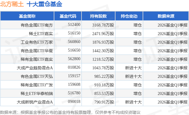 根据2026基金Q1季报公募基金重仓股数据,重仓该股的公募基金共102家,其中持有数量最多的公募基金为南方基金的有色金属ETF南方。有色金属ETF南方目前规模为275.67亿元,最新净值2.1807(4月22日),较上一交易日上涨0.08%,近一年上涨107.64%。该公募基金现任基金经理为崔蕾。崔蕾在任的基金产品包括:南方有色金属ETF联接A,管理时间为2019年7月12日至今,期间收益率为229.18%;中证1000ETF南方,管理时间为2019年7月12日至今,期间收益率为98.71%;红利低波50ETF南方,管理时间为2020年1月17日至今,期间收益率为100.19%。