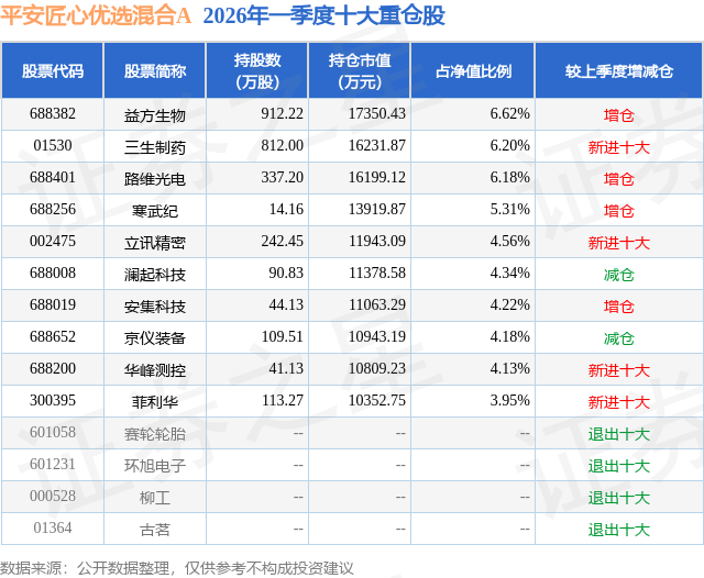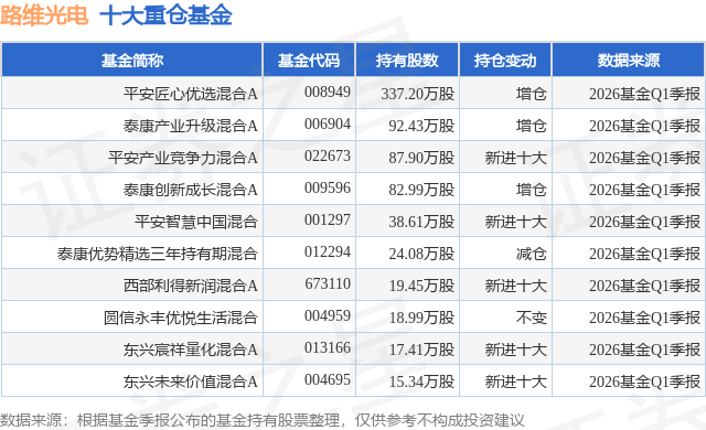 根据2026基金Q1季报公募基金重仓股数据,重仓该股的公募基金共22家,其中持有数量最多的公募基金为平安基金的平安匠心优选混合A。平安匠心优选混合A目前规模为21.21亿元,最新净值1.6752(4月22日),较上一交易日上涨3.29%,近一年上涨48.43%。该公募基金现任基金经理为张淼。张淼在任的基金产品包括:平安智慧中国混合,管理时间为2025年6月4日至今,期间收益率为54.66%;平安港股通医疗创新精选混合A,管理时间为2025年6月11日至今,期间收益率为1.77%;平安港股医疗优选股票(QDII)A,管理时间为2026年1月29日至今,期间收益率为8.31%。