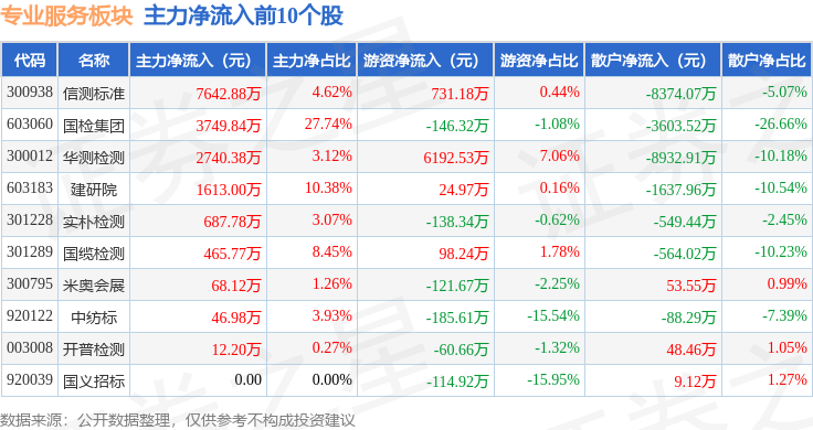 从资金流向上来看,当日专业服务板块主力资金净流出5786.56万元,游资资金净流入1.18亿元,散户资金净流出6049.03万元。专业服务板块个股资金流向见下表: