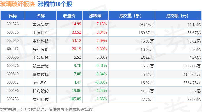 证券之星消息,4月23日玻璃玻纤板块较上一交易日上涨1.34%,国际复材领涨。当日上证指数报收于4093.25,下跌0.32%。深证成指报收于15043.45,下跌0.88%。玻璃玻纤板块个股涨跌见下表: