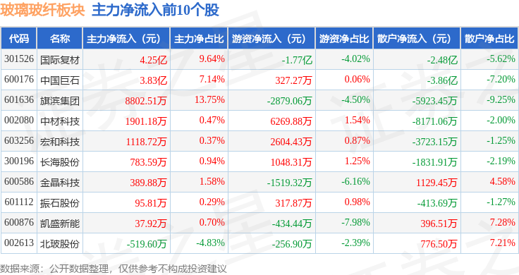 从资金流向上来看,当日玻璃玻纤板块主力资金净流入4.49亿元,游资资金净流出1.63亿元,散户资金净流出2.86亿元。玻璃玻纤板块个股资金流向见下表: