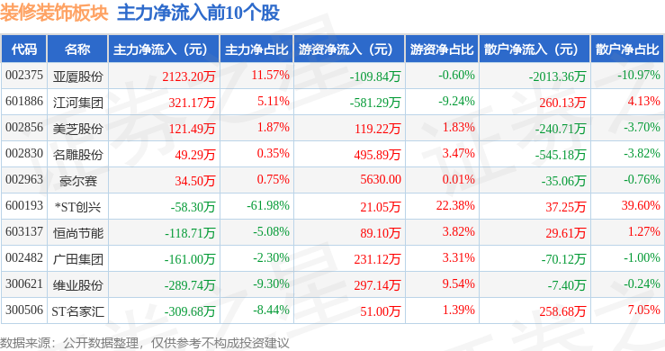 从资金流向上来看,当日装修装饰板块主力资金净流出2.39亿元,游资资金净流入1474.05万元,散户资金净流入2.25亿元。装修装饰板块个股资金流向见下表: