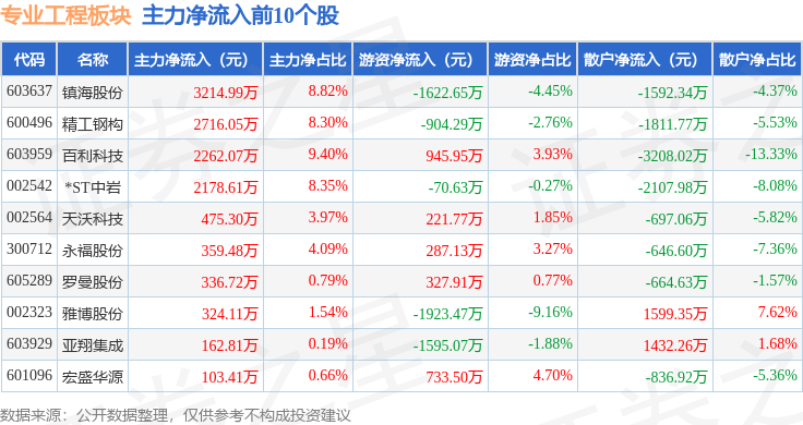 从资金流向上来看,当日专业工程板块主力资金净流出5.99亿元,游资资金净流出6995.91万元,散户资金净流入6.69亿元。专业工程板块个股资金流向见下表: