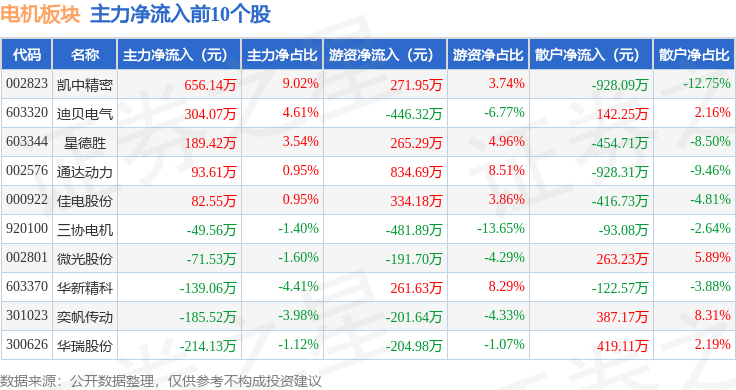 从资金流向上来看,当日电机板块主力资金净流出5.81亿元,游资资金净流入5530.9万元,散户资金净流入5.26亿元。电机板块个股资金流向见下表:
