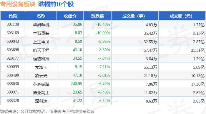 证券之星消息,4月23日专用设备板块较上一交易日下跌1.35%,华研精机领跌。当日上证指数报收于4093.25,下跌0.32%。深证成指报收于15043.45,下跌0.88%。专用设备板块个股涨跌见下表: