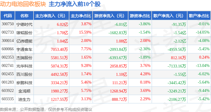 从资金流向上来看,当日动力电池回收板块主力资金净流出57.3亿元,游资资金净流入7.91亿元,散户资金净流入49.4亿元。动力电池回收板块个股资金流向见下表: