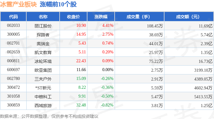证券之星消息,4月23日冰雪产业板块较上一交易日下跌0.94%,晶雪节能领跌。当日上证指数报收于4093.25,下跌0.32%。深证成指报收于15043.45,下跌0.88%。冰雪产业板块个股涨跌见下表:
