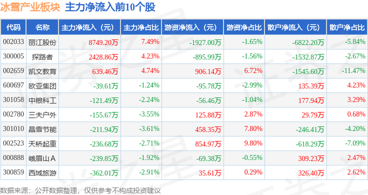 从资金流向上来看,当日冰雪产业板块主力资金净流出4.46亿元,游资资金净流出4637.42万元,散户资金净流入4.92亿元。冰雪产业板块个股资金流向见下表:
