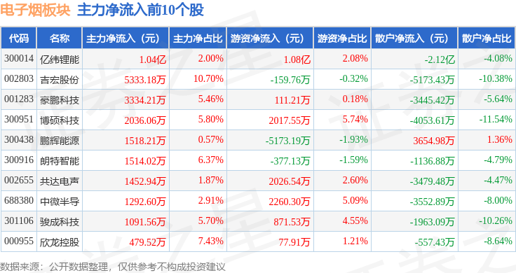 从资金流向上来看,当日电子烟板块主力资金净流出27.13亿元,游资资金净流入5.42亿元,散户资金净流入21.71亿元。电子烟板块个股资金流向见下表: