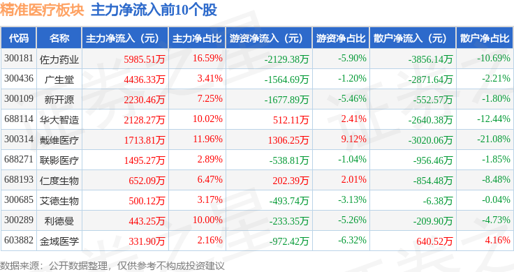 从资金流向上来看,当日精准医疗板块主力资金净流出2.86亿元,游资资金净流入1.07亿元,散户资金净流入1.79亿元。精准医疗板块个股资金流向见下表: