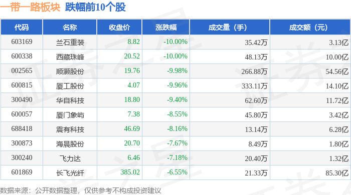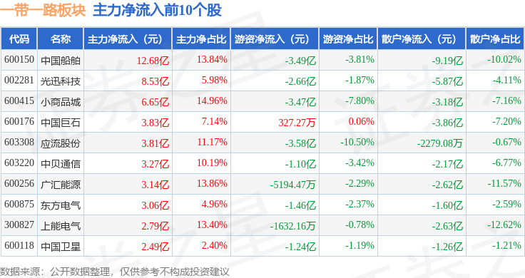 从资金流向上来看,当日一带一路板块主力资金净流出116.45亿元,游资资金净流入18.04亿元,散户资金净流入98.4亿元。一带一路板块个股资金流向见下表: