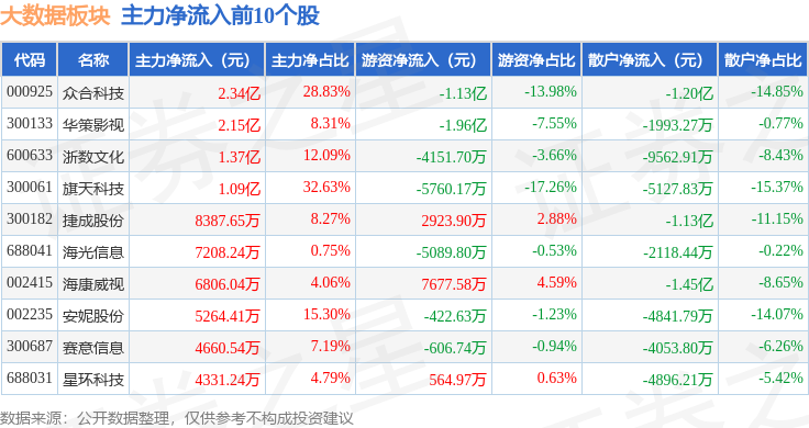 从资金流向上来看,当日大数据板块主力资金净流出103.84亿元,游资资金净流入20.47亿元,散户资金净流入83.37亿元。大数据板块个股资金流向见下表: