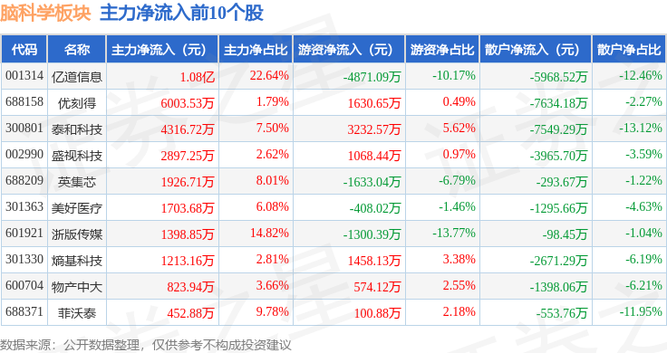 从资金流向上来看,当日脑科学板块主力资金净流出36.49亿元,游资资金净流入8.94亿元,散户资金净流入27.55亿元。脑科学板块个股资金流向见下表:
