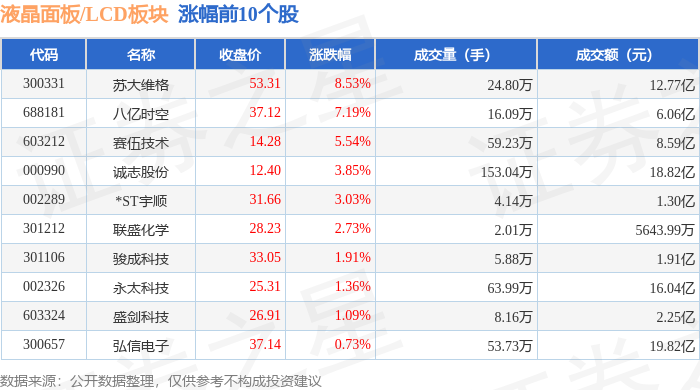 证券之星消息,4月23日液晶面板/LCD板块较上一交易日下跌2.13%,大东南领跌。当日上证指数报收于4093.25,下跌0.32%。深证成指报收于15043.45,下跌0.88%。液晶面板/LCD板块个股涨跌见下表: