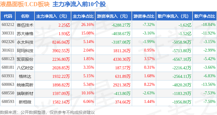 从资金流向上来看,当日液晶面板/LCD板块主力资金净流出52.17亿元,游资资金净流入15.72亿元,散户资金净流入36.46亿元。液晶面板/LCD板块个股资金流向见下表: