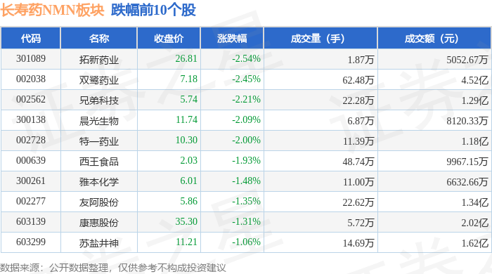 证券之星消息,4月23日长寿药NMN板块较上一交易日下跌0.11%,拓新药业领跌。当日上证指数报收于4093.25,下跌0.32%。深证成指报收于15043.45,下跌0.88%。长寿药NMN板块个股涨跌见下表: