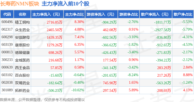 从资金流向上来看,当日长寿药NMN板块主力资金净流出2443.85万元,游资资金净流入160.35万元,散户资金净流入2283.5万元。长寿药NMN板块个股资金流向见下表: