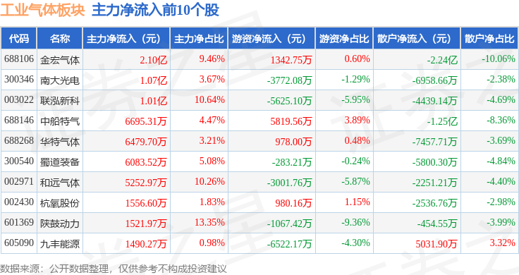 从资金流向上来看,当日工业气体板块主力资金净流出1.04亿元,游资资金净流出4077.68万元,散户资金净流入1.44亿元。工业气体板块个股资金流向见下表: