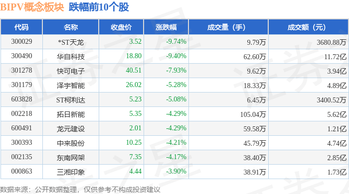 证券之星消息,4月23日BIPV概念板块较上一交易日下跌0.22%,*ST天龙领跌。当日上证指数报收于4093.25,下跌0.32%。深证成指报收于15043.45,下跌0.88%。BIPV概念板块个股涨跌见下表: