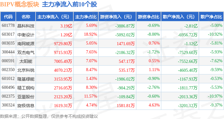 从资金流向上来看,当日BIPV概念板块主力资金净流出10.46亿元,游资资金净流入1.7亿元,散户资金净流入8.75亿元。BIPV概念板块个股资金流向见下表: