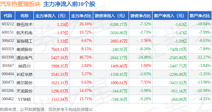 从资金流向上来看,当日汽车热管理板块主力资金净流出34.51亿元,游资资金净流入9.17亿元,散户资金净流入25.34亿元。汽车热管理板块个股资金流向见下表: