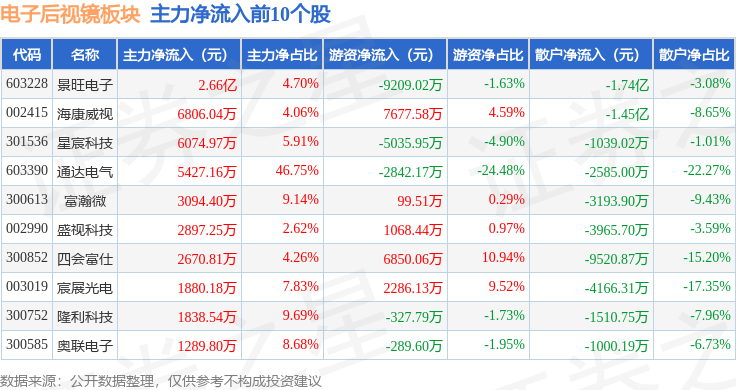 从资金流向上来看,当日电子后视镜板块主力资金净流出12.65亿元,游资资金净流入6.78亿元,散户资金净流入5.87亿元。电子后视镜板块个股资金流向见下表: