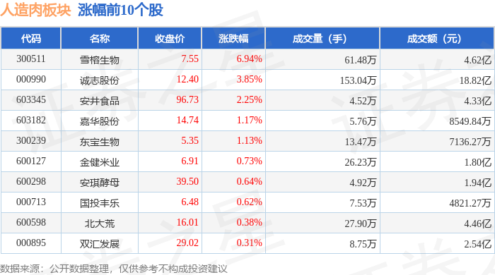 证券之星消息,4月23日人造肉板块较上一交易日上涨0.02%,雪榕生物领涨。当日上证指数报收于4093.25,下跌0.32%。深证成指报收于15043.45,下跌0.88%。人造肉板块个股涨跌见下表:
