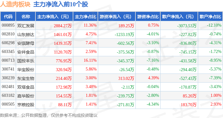 从资金流向上来看,当日人造肉板块主力资金净流出5.23亿元,游资资金净流入1.19亿元,散户资金净流入4.04亿元。人造肉板块个股资金流向见下表: