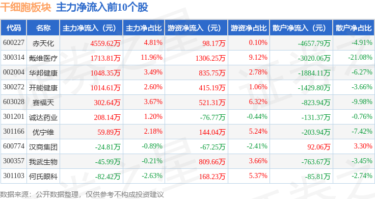 从资金流向上来看,当日干细胞板块主力资金净流出4.41亿元,游资资金净流出1187.52万元,散户资金净流入4.53亿元。干细胞板块个股资金流向见下表: