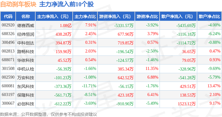 从资金流向上来看,当日自动刹车板块主力资金净流出9.83亿元,游资资金净流入3.38亿元,散户资金净流入6.44亿元。自动刹车板块个股资金流向见下表: