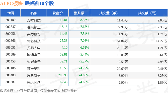 证券之星消息,4月23日AI PC板块较上一交易日下跌1.86%,万祥科技领跌。当日上证指数报收于4093.25,下跌0.32%。深证成指报收于15043.45,下跌0.88%。AI PC板块个股涨跌见下表: