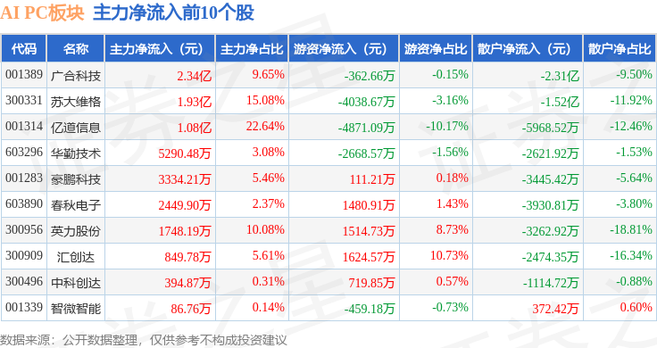 从资金流向上来看,当日AI PC板块主力资金净流出13.22亿元,游资资金净流入2.07亿元,散户资金净流入11.14亿元。AI PC板块个股资金流向见下表: