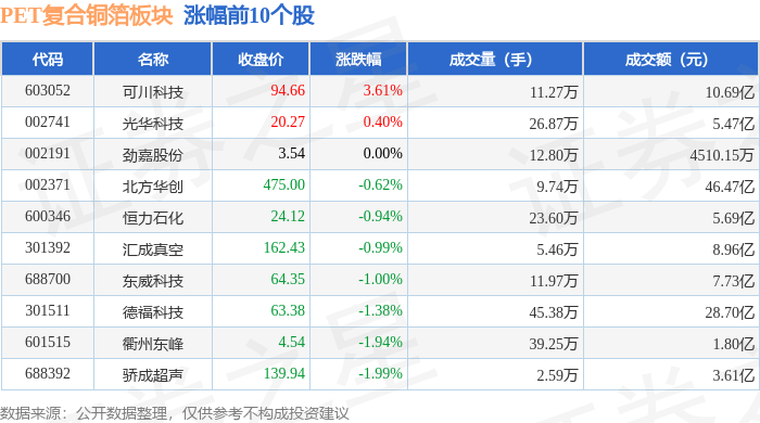 从资金流向上来看,当日PET复合铜箔板块主力资金净流出29.2亿元,游资资金净流入2.85亿元,散户资金净流入26.34亿元。PET复合铜箔板块个股资金流向见下表: