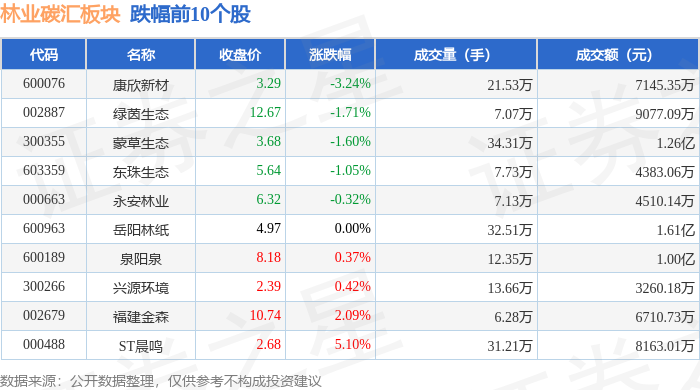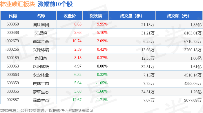 证券之星消息,4月23日林业碳汇板块较上一交易日上涨1.03%,国检集团领涨。当日上证指数报收于4093.25,下跌0.32%。深证成指报收于15043.45,下跌0.88%。林业碳汇板块个股涨跌见下表:
