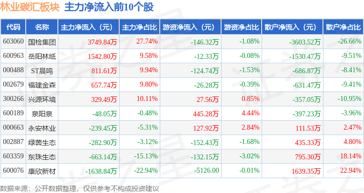 从资金流向上来看,当日林业碳汇板块主力资金净流入2283.85万元,游资资金净流出256.32万元,散户资金净流出2027.52万元。林业碳汇板块个股资金流向见下表: