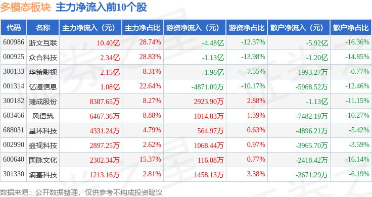 从资金流向上来看,当日多模态板块主力资金净流出3.28亿元,游资资金净流出1.95亿元,散户资金净流入5.23亿元。多模态板块个股资金流向见下表: