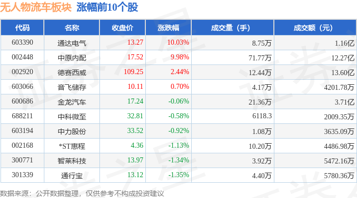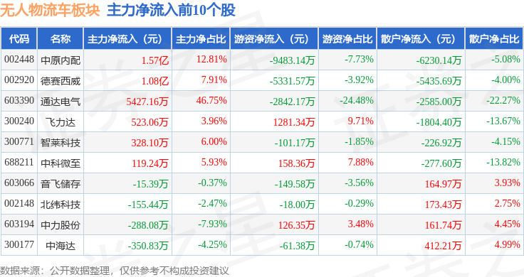 从资金流向上来看,当日无人物流车板块主力资金净流出1.56亿元,游资资金净流出6262.43万元,散户资金净流入2.18亿元。无人物流车板块个股资金流向见下表: