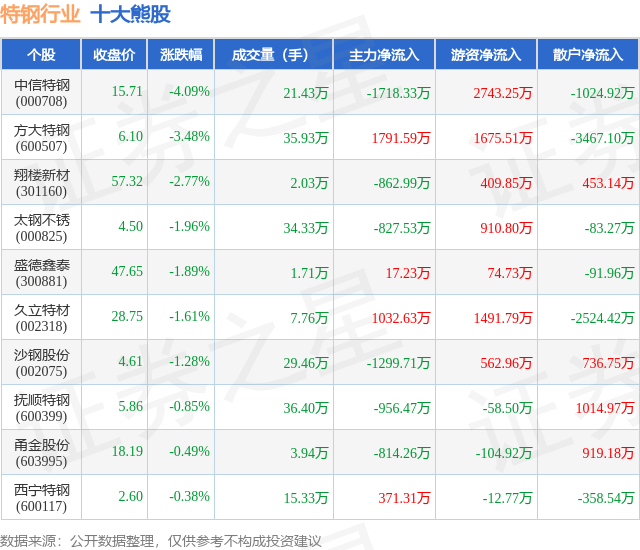 个股表现方面,特钢行业当日领跌股为中信特钢(000708),该股当日报收15.71,下跌4.09%,成交量21.43万,主力资金净流出1718.33万元。方大特钢(600507)以下跌3.48%紧随其后,该股当日成交量35.93万,主力资金净流入1791.59万元。除此之外,翔楼新材(301160)、太钢不锈(000825)、盛德鑫泰(300881)均进入当日熊股之列。具体个股列表见下表: