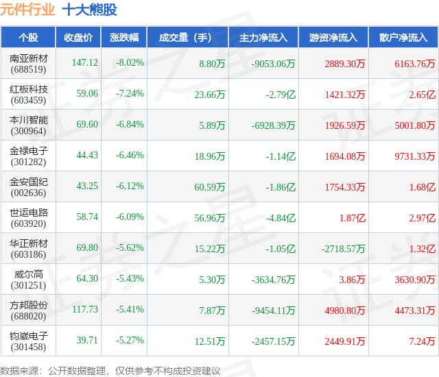 个股表现方面,元件行业当日领跌股为南亚新材(688519),该股当日报收147.12,下跌8.02%,成交量8.8万,主力资金净流出9053.06万元。红板科技(603459)以下跌7.24%紧随其后,该股当日成交量23.66万,主力资金净流出2.79亿元。除此之外,本川智能(300964)、金禄电子(301282)、金安国纪(002636)均进入当日熊股之列。具体个股列表见下表: